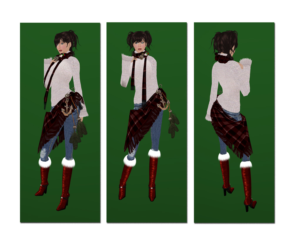 This look popped in my head when I received a group message from Lyra Muse that she had some limited in time boots out at Last Call. They are very holidayish… with the white fur trim (the boots come in green, black and silver too) so I wanted to pair them with a slightly more day to day look.. after all.. we’re getting close, but it ain’t X-mas yet. Last week when I found the scarf and waistcloth at Creamshop, I just HAD to have them, but until now they were idling in my inventory. I think they are doing really well together, the boots and the plaids.