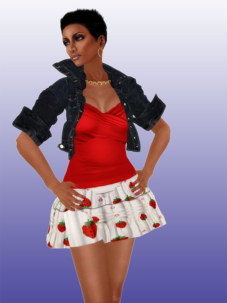 Opposites make interesting looks when paired in an outfit. The Cutesy strawberry mini skirt from ❤ Cupcakes with the red wrap top from the same brand, mixed with Coco’s midnight denim jacket remind me of what a lot of girls used to wear in high school (mind you, mid 80’s). But most of us back then had girly braids or ponytails, making the outfit just sweet… This time I’ve chosen to wear a more bold look, with KMADD’s Army crop, which was made for male Belezza skins, but I don’t really care about that label, because it’s a perfect match with my hair based PXL skins as well. Speaking of which, I’m wearing the latest beta version of Kim in the tan version and it’s going to be so pretty.